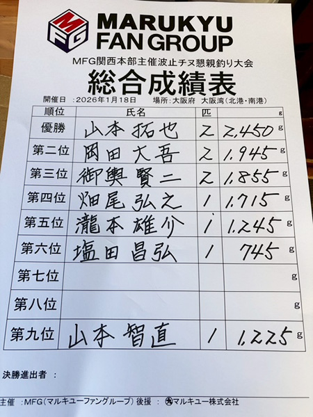 | 5位 | 瀧本 雄介 | 1匹 | 1,245g | 6位 | 塩田 昌弘 | 1匹 | 745g |