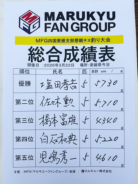 2026年3月22日(日)MFG四国愛媛支部懇親チヌ釣り大会を、愛媛県今治市沖にて開催しました。
